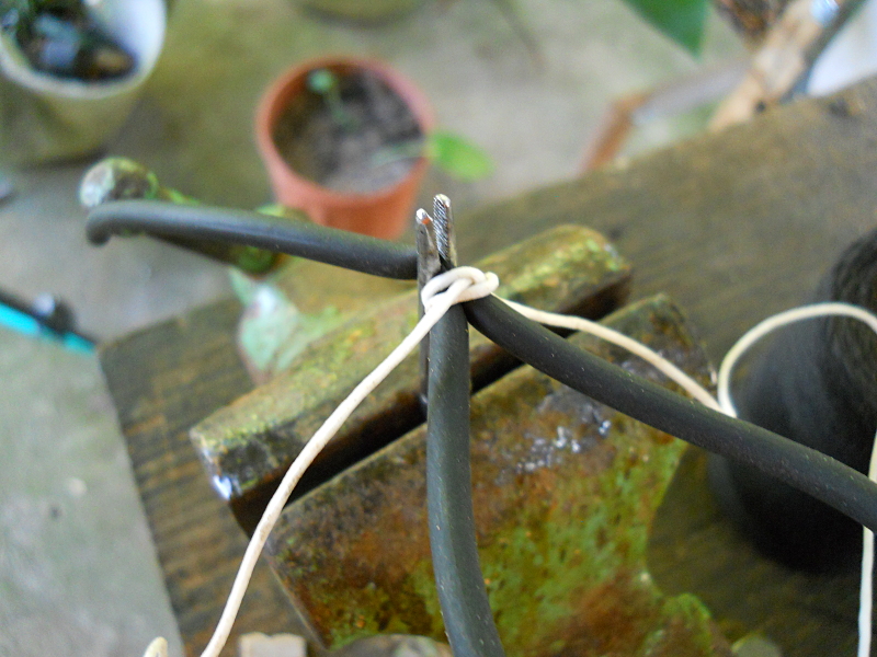 Slip a pre-tied constrictor knot over the loop. This is waxed string that I get from a leather shop. It measures .045 inch (1.14 mm). Do not tighten it at this point.